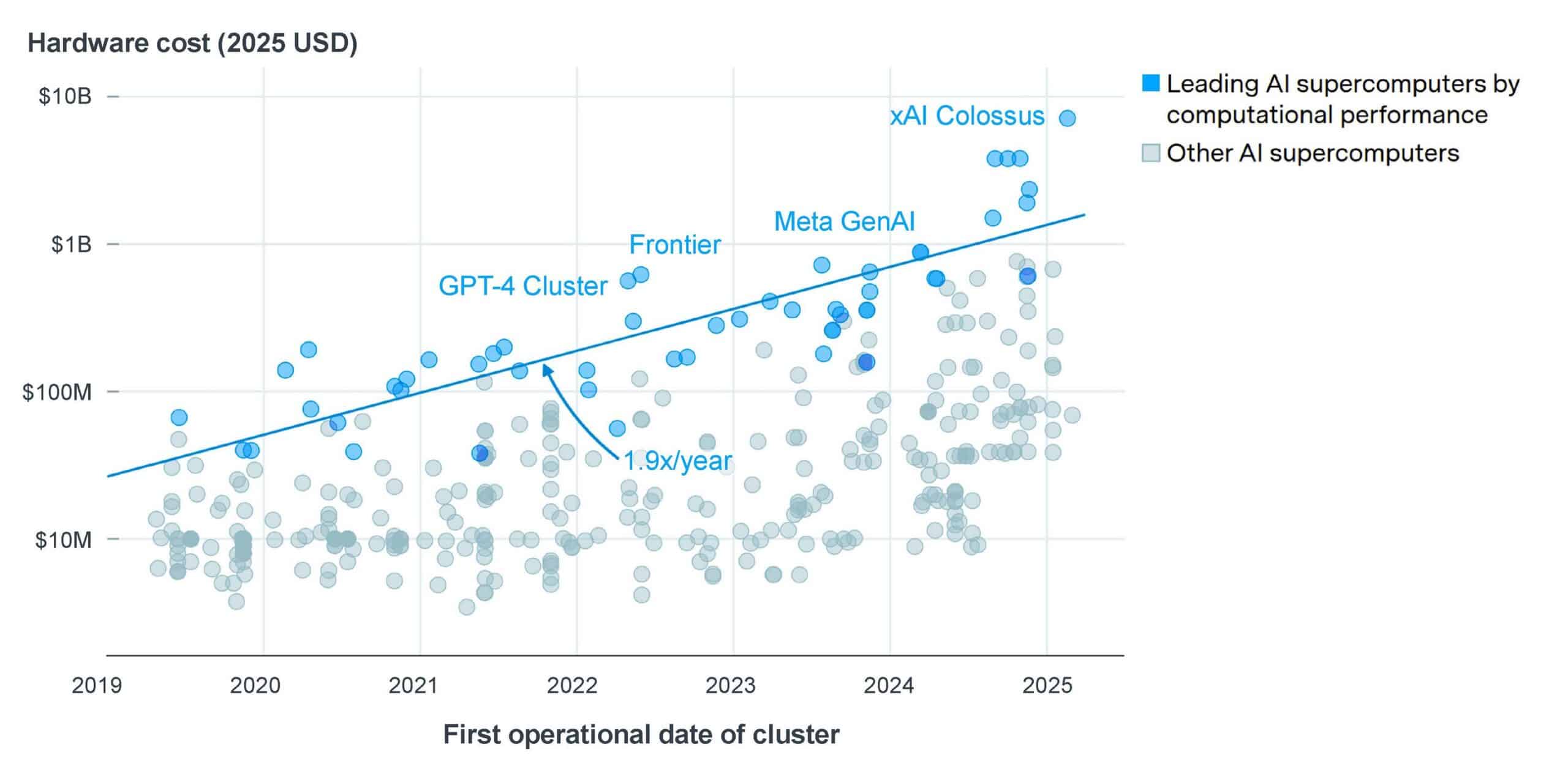Le coût des technologies de l'information nécessaires pour alimenter la révolution actuelle de l'IA ne peut être décrit que comme stupéfiant. Le financement des principaux superordinateurs d'IA, qui alimentent des entreprises comme OpenAI et Anthropic, adoublé à peu près chaque année depuis leur création. La grappe GPT-4 a coûté à elle seule des centaines de millions de dollars, tandis que le superordinateur Colossus de xAI a coûté 10 milliards de dollars. Et nous n'en sommes qu'au début, avec une demande toujours croissante d'IA qui alimente de plus en plus d'investissements d'infrastructure. Pour ceux d'entre nous qui passent beaucoup de temps à réfléchir à l'origine de la création de valeur durable dans les technologies, il est difficile d'ignorer cette trajectoire, et encore plus difficile de l'exagérer.