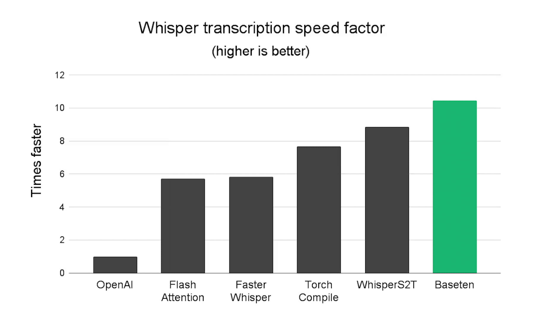 Baseten*, par exemple, fournit la transcription de la parole/reconnaissance AI Whisper plus de 10 fois plus vite que la référence OpenAI. Ce type de performance n'a rien d'excitant sur une diapositive. Mais cela ressemble à de la survie lorsque vos coûts d'inférence engloutissent vos marges.