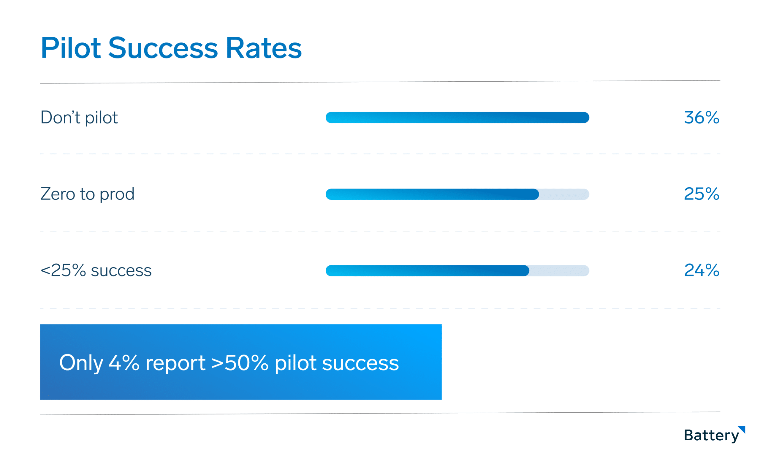 But beneath that pipeline sits a striking failure rate. Among CFOs who have piloted AI, only four percent report a pilot success rate above 50%.