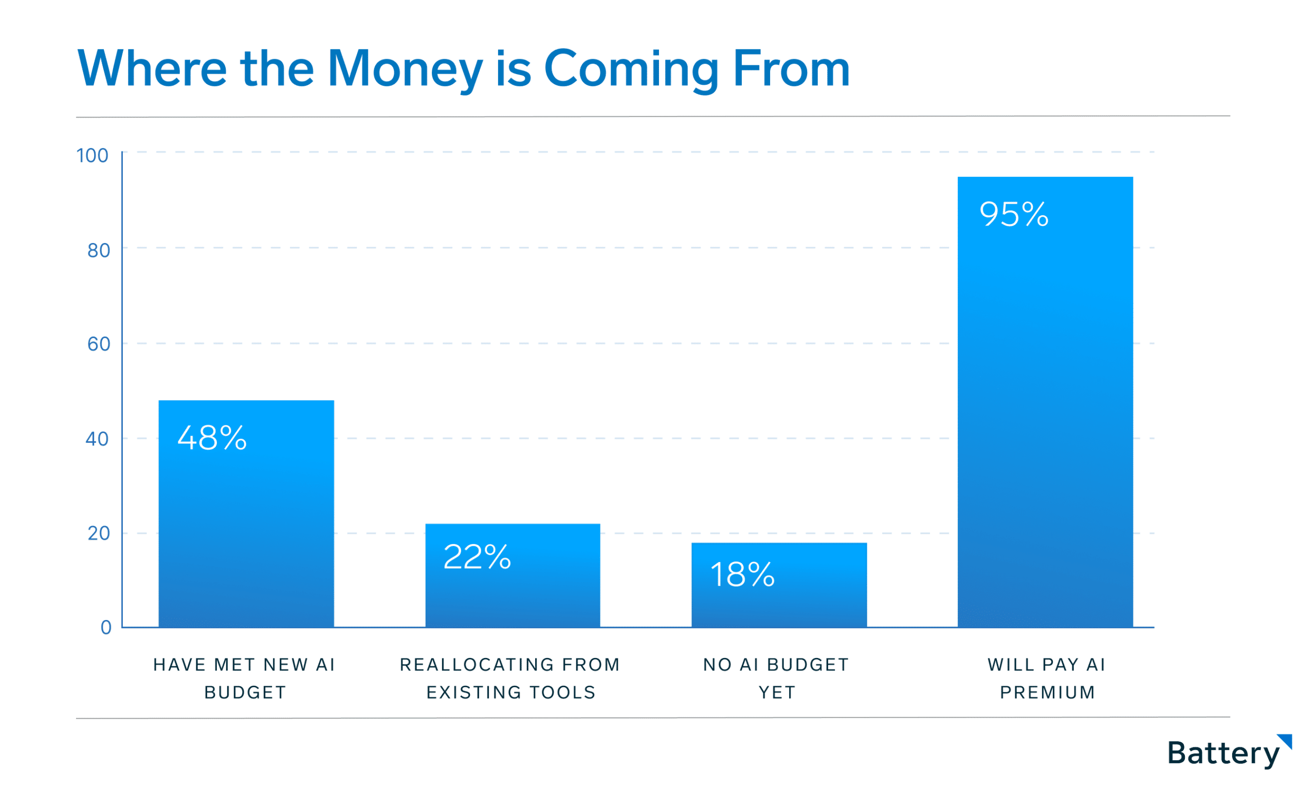 In terms of budgets, 48% of respondents have carved out net-new AI spend, 22% plan to reallocate from existing tools and 18% have no AI budget today.