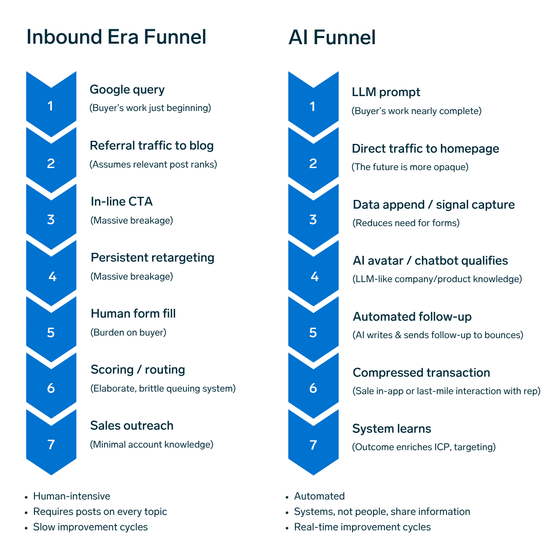 Cette diapositive compare l'entonnoir classique des ventes B2B entrantes à l'entonnoir émergent de l'IA. À première vue, ils se ressemblent : ils commencent tous deux par une requête, passent par une série d'opérations technologiques et, si tout se passe bien, aboutissent à une vente. Mais la similitude s'arrête là. La différence commence au sommet.